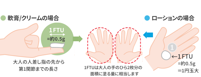 軟膏・クリームは人差し指の先から第一関節まで、ローションは1円玉大が、約0.5gとなり大人の手のひら2枚分となる